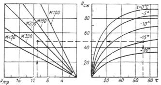 1.6. Введение сульфитно-дрожжевой бражки (СДБ) необходимо назначать для бетона и раствора с 5 % поташа в количестве 1-2 %, для бетона и раствора с 10 % поташа в количестве 1-1,5 %. Точное значение устанавливается строительной лабораторией путем выполнения пробных замесов. 2. ТРЕБОВАНИЯ К МАТЕРИАЛАМ2.1. Приготовление бетона и раствора следует выполнять на портландцементе и быстротвердеющем портландцементе активностью не ниже 400 кгс/см2 с содержанием С3А не более 8 %. Цементы должны удовлетворять требованиям государственных стандартов на портландцемент, шлакопортландцемент, пуццолановый портландцемент и их разновидности. 2.2. Щебень, используемый для приготовления бетона, должен удовлетворять требованиям ГОСТ 10268-70*. 2.3. Керамзит, используемый в качестве крупного заполнителя, должен соответствовать требованиям ГОСТ 9758-68. 2.4. Песок, используемый для приготовления бетона и раствора, должен соответствовать требованиям ГОСТ 8736-67*. 2.5. Вода не должна содержать вредных примесей, отрицательно влияющих на нормальное схватывание и твердение бетона и раствора, и удовлетворять требованиям ГОСТ 2874-73. 2.6. Поташ (К2СО3) должен удовлетворять требованиям ГОСТ 10690-73, а нитрит натрия - требованиям ГОСТ 19906-74. 2.7. Сульфитно-дрожжевая бражка (СДБ) должна удовлетворять требованиям Указаний по применению бетонов с добавкой концентратов сульфитно-дрожжевой бражки. 3. ТРЕБОВАНИЯ К БЕТОНУ И РАСТВОРУ. ПРОИЗВОДСТВО РАБОТ3.1. Горизонтальные и вертикальные швы между сборными элементами следует заполнять цементно-песчаным раствором. Горизонтальные и вертикальные стыки, являющиеся конструктивными элементами, после соединения металлических связей необходимо заполнять цементно-песчаным раствором, мелкозернистым тяжелым бетоном, легким бетоном на искусственных пористых заполнителях. Вид бетона, а также марка бетона и раствора должны быть указаны в проекте. 3.2. Монтаж конструкций верхних пяти этажей 9-12-этажных жилых домов в зимних условиях следует выполнять, если прочность бетона и раствора в горизонтальных и вертикальных стыках к моменту возведения шестого и последующих этажей достигает требуемых значений. Требуемая прочность бетона в вертикальных стыках, расположенных ниже монтируемых на пять этажей, должна составлять не менее 5 МПа. Требуемая минимальная прочность бетона или раствора горизонтальных швов и стыков на уровне перекрытий всех этажей, кроме верхних пяти, должна рассчитываться для каждого конкретного проекта дома с учетом характеристики климатического района строительства и конструктивных особенностей дома. Расчет требуемой прочности бетона и раствора должен выполняться проектной организацией, осуществляющей разработку или привязку проекта. Методика расчета требуемой минимальной прочности бетона или раствора в горизонтальных швах и стыках приведена в прил. 1 к настоящей Инструкции. Рис. 1. Номограмма для определения марки бетона и раствора с добавкой поташа t - средняя температура воздуха, °С; Rсж - гарантируемая относительная прочность бетона и раствора при сжатии, % R28; Rтр - минимальная требуемая прочность бетона и раствора, МПа, t - время твердения бетона и раствора, сут. 3.3. Марка бетона и раствора для несущих горизонтальных и вертикальных швов и стыков должна уточняться, но номограммам, представленным на рис. 1 и 2. Номограммы увязывают, темны в