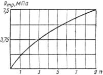График контроля прочности раствора в горизонтальных швах применительно к конкретным условиям строительства дан на примере 9-этажного дома серии 1-464Д и приведен па рис. 4. Для удобства работы шкала графика представлена не в процентах, а в натуральных единицах. При переводе шкалы считали, что деление, равное 100 %, соответствует наибольшему табличному значению прочности раствора Rтр, приведенному в прил. 1 настоящей Инструкции, которое составляет 7,5 МПа. Прочие числа на шкале рассчитываются пропорционально процентам. Например, вместо Rтр = 50 % на шкале нужно поставить Rтр= = 0,5·75 = 3,75 МПа.