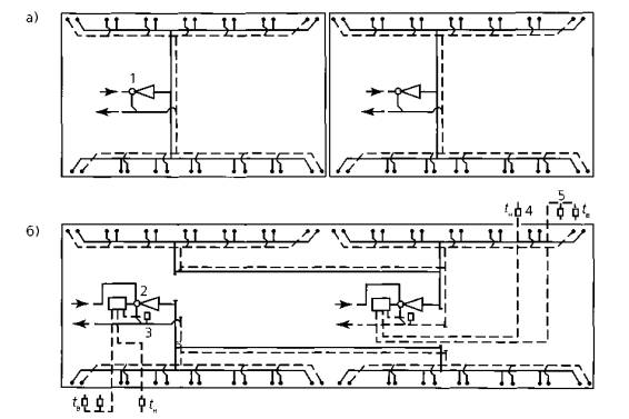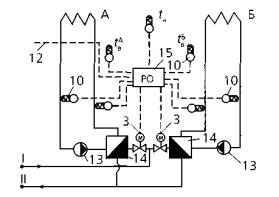 Второй способ, как показывает практика, рекомендуется применять при автоматизации систем, в которых возможно изменение расхода циркулирующего теплоносителя (например, при подключении системы отопления к тепловым сетям через элеватор с регулируемым соплом, корректирующим насосом, установленным на перемычке между подающим и обратным трубопроводами). Контроль температуры в обратном трубопроводе гарантирует нормальный прогрев последних по ходу теплоносителя в стояке отопительных приборов.
