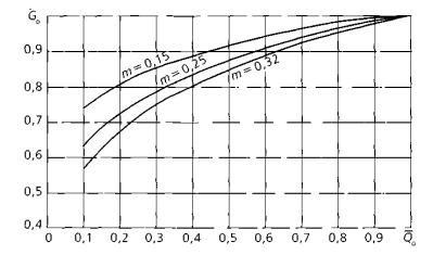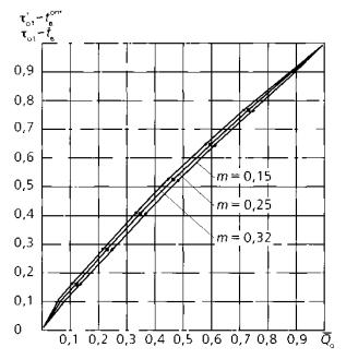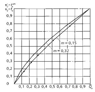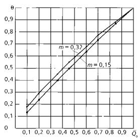 На рисунке Г.3 приведены требуемые графики изменения относительной температуры воды для однотрубных систем отопления в подающем ((τто1 - tвопт) / (τо1 - tв)) и обратном ((τт2 - tвопт) / (τ2 - tв)) трубопроводах, обозначаемые критерием θ и определенные исходя из обеспечения одинакового изменения теплоотдачи первых и последних по ходу воды в стояке отопительных приборов. При этом в системах отопления расход циркулирующего теплоносителя должен изменяться (количественно-качественное регулирование) в соответствии с графиками, приведенными на рисунке Г.4. Графики построены по следующим формулам для различных т: