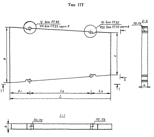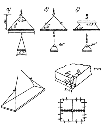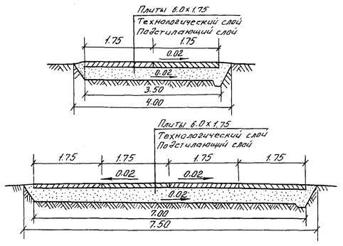 трапецеидальных 1ПТ35 ( Рис. 3.1.7. Раскладка шестиугольных плит при различных профилях и ширине проезжей части: 1 - плиты; 2 - песок, стабилизированный цементом; 3 - песок. 3.2.4. При строительстве сборных постоянных городских дорог и проездов укладку плит осуществляют по неуплотненному технологическому слою толщиной 3 - 5 см. 3.2.5. Транспортировка плит на объект может осуществляться бортовыми автомобилями и автопоездами соответствующей грузоподъемности. 3.2.6. Монтаж плит производят с помощью четырехветвевого стропа самоходными кранами, характеристики которых даны в приложении 2. 3.2.7. Монтаж покрытия рекомендуется вести «с колес» без промежуточного складирования плит на объекте. Складируют плиты при необходимости вдоль дороги на спланированные площадки в штабеля по 7 - 8 штук с таким расчетом, чтобы обеспечить минимальное число изменений положения крана при монтаже покрытия. 3.2.8. Автомобильные и пневмоколесные краны укладывают плиты с готового покрытия способом «от себя»; гусеничные краны для предотвращения повреждений плит должны работать, как правило, с грунта. Автомобиль с плитами устанавливают так, чтобы угол поворота стрелы крана при монтаже был минимальным. На рис. 3.2.1 показана укладка плит двумя кранами в одном потоке. 3.2.9. Укладку плит производят в зависимости от ширины проезжей части. При двухскатном профиле монтаж ведется от оси дороги к ее краям. При односкатном профиле монтаж ведется поперечными рядами от края до края. Разбивка продольной оси дороги и осей рядов плит производится теодолитом. 3.2.10. Плиты укладывают так, чтобы они имели контакт с основанием по всей своей площади. Перекосы при опускании плит недопустимы. 3.2.11. Грани плит выравнивают по натянутому шнуру, расположенному вдоль укладываемого ряда, проверяют плотность примыкания плит и правильность расположения поверхностей. Допускаемая ширина швов между плитами с вертикальными гранями - 6 - 8 мм; плиты с технологическими скосами укладываются вплотную друг к другу. Уступы в швах смежных плит не должны превышать 2 см. Для обеспечения требуемой ширины швов между плитами целесообразно применять шаблоны (рис. 3.2.2). 3.2.12. Для монтажа шестиугольных плит применяют цанговый захват. 3.2.13. Монтаж плит беспетлевой конструкции производится с помощью одноветвевого стропа (чалки) с диаметром каната 14 мм. Для этой цели вместо монтажных петель в плите предусмотрены специальные пазы по коротким торцам. Схемы строповки и монтаж покрытия приведены на рис. 3.2.3. Рис. 3.1.8. Поперечные профили временных дорог с покрытием из плит размером 6,0×1,75 м. Рис. 3.2.1. Укладка плит двумя кранами в одном потоке: 1 - подготовленное основание; 2 - плиты в момент кладки; 3 - плиты, вывезенные заранее на обочину; 4 - краны, укладывающие плиты; 5 - уложенные плиты. Рис. 3.2.2. Металлический шаблон для контроля ширины швов: Рис. 3.2.3. Схемы строповки и монтажа покрытия. а) чалка длиной 10,5 м; б) чалка длиной 4,4 м и двухветвевой строп; в) чалка длиной 4,4 м и траверса грузоподъемностью 4 т. 3.2.14. Вибропосадку шестигранных плит производят с помощью вибропосадочной машины. Продолжительность вибропосадки - 30 - 50 сек. 3.2.15. Омоноличивание покрытия из плит, имеющих монтажные петли в углах плит, производят сваркой закладных деталей смежных плит после выравнивания покрытия. 3.2.16. После вибропосадки, выравнивания и омоноличивания покрытия прои