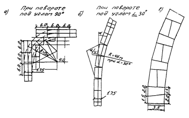 Примечание. Масса плит приведена для бетона средней плотностью 2500 кг/м3. Рис. 3.1.1. Прямоугольная плита. Рис. 3.1.3. Трапецеидальная плита. Рис. 3.1.6. Схемы раскладки плит на поворотах временных дорог: а и б - прямоугольных плит 1ПБ60.18 (6,0×1,75); в -