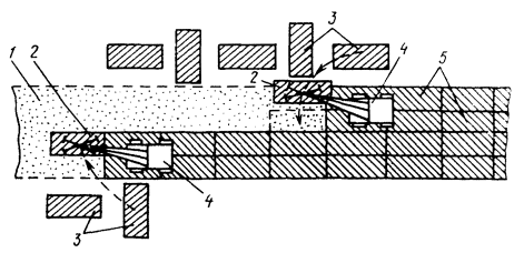 5.1.4. Отклонения от размеров бортовых камней по длине и высоте не должны превышать + 5 мм. 5.1.5. Внешний вид и качество поверхности бортовых камней должны удовлетворять следующим требованиям: - искривление лицевой поверхности по длине камня не должно превышать 3 мм на 1 м длины; - неперпендикулярность боковых (торцевых) и продольных лицевых плоскостей не должна превышать 2 мм; - трещины на камнях не допускаются. 5.1.6. Бортовые бетонные камни длиной 1 м всех марок и бортовые камни длиной 3 м, высотой 450 и 600 мм должны изготавливаться из бетона без армирования, бортовые камни длиной 3 м, высотой 300 мм - из железобетона, а камни длиной 6 м - из предварительно-напряженного железобетона. 5.1.7. Бортовые камни длиной 3 м должны изготавливаться с уширенным основанием - контрофорсом. Бортовые камни длиной 6 м могут быть изготовлены с лотком и без лотка. 5.2. Технология установки бортовых камней.5.2.1. Последовательность работ по установке бортовых камней следующая: - инструментальная разбивка; - подготовка земляного полотна; - подготовка бортовых камней к установке; - установка опалубки; - устройство цементобетонного основания; - установка бортовых камней; - укладка цементобетона в опалубку; - заделка и расшивка швов. При установке длинномерных бортовых камней монолитное цементобетонное основание не устраивается. Схема установки бортового камня представлена на рис. 5.2.1. 5.2.2. Бортовые камни доставляют на объект в специальных контейнерах (поддонах). Разгрузку и установку камней производят автокраном КС-2561К-1 и погрузчиком ТО-30. 5.2.3. Бортовые камни устанавливаются при помощи машин или, чаще всего, вручную с применением приспособлений, представленных на рис. 5.2.2. 5.2.4. Перед установкой бортовых камней длиной 1 м по тщательно выровненному и уплотненному земляному полотну распределяют песчаный подстилающий слой толщиной 10 см, по которому устраивают бетонное основание толщиной 10 см (подушку). Установку бортовых камней производят по шнуру, натянутому между специальными металлическими штырями на высоте, соответствующей отметке верхней кромки камней. 5.2.5. С двух сторон бортового камня устраивают бетонную обойму высотой 10 см в деревянной или металлической опалубке. Рис. 5.2.1. Схема установки бортового камня: 1 - опалубка; 2 - бетонное основание под бортовой камень; 3 - участок добетонирования; 4 - бортовой камень; 5 - песчаный подстилающий слой. Рис. 5.2.2. Схемы приспособлений для установки бортовых камней. 5.2.6. Длинномерные бортовые камни длиной 3 и 6 м устанавливают непосредственно на песчаное основание или основание дорожной одежды, предусмотренное проектом, под стыками камней укладывают бетонные подкладки. Установку камней производят автокранами грузоподъемностью 3 т или автопогрузчиками (рис. 5.2.3.).