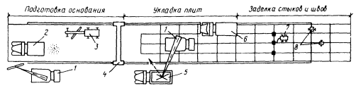 Рис. 3.2.5. Технологическая схема устройства сборного покрытия из железобетонных плит: 1 - самоходные краны; 2 - автомобнли-самосвалы; 3 - автогрейдер; 4 - профилировщик основания; 5 - автомобили для вывозки плит; 6 - вибропосадочная машина; 7 - электросварочный агрегат; 8 - заливщик швов. 3.2.21. Работы по устройству покрытия во время сильного снегопада следует приостанавливать. Подготовленные участки выравнивающего слоя следует укрывать передвижными навесами, брезентом или соломенными матами. При температуре наружного воздуха ниже - 15 °С монтаж покрытия производить не рекомендуется. 3.2.22. При устройстве покрытия в зимнее время вибропосадку плит и заделку швов рекомендуется производить весной после стабилизации основания и устранения дефектов и нарушений ровности. В случае необходимости заделки швов зимой следует предварительно подогреть места сопряжения плит и заполнить их на 2/3 высоты подогретой до 35 °С цементно-песчаной смесью и на 1/3 высоты мастикой при t = 200 °С. 3.2.23. Перед устройством выравнивающего слоя поверхность основания тщательно очищают от снега, льда и грязи бульдозером или автогрейдером. Для облегчения удаления льда и снега рекомендуется применять раствор CaCl2 в количестве 1 л/м2. 3.2.24. Технологическая схема устройства сборного покрытия из шестиугольных плит по двум вариантам приведена на рис. 3.2.4: - с применением профилировщика ДС-178; - с применением укладчика щебня и гравия СД-406 на гусеничном ходу. 3.2.25. Технологическая схема устройства сборного покрытия из прямоугольных плит представлена на рис. 3.2.5. 4. СБОРНЫЕ ПОКРЫТИЯ ТРОТУАРОВ.4.1. Общие требования.4.1.1. Устройство тротуаров, садово-парковых пешеходных дорожек и площадок осуществляют с покрытием из сборных квадратных (К), прямоугольных (П), шестиугольных (Ш), фигурных бетонных плит и элементов мощения (Ф) и элементов декоративных дорожных (ЭДД). Виды, марки и размеры тротуарных плит согласно ГОСТ 17608-91 представлены в табл. 4.1.1. Из таблицы видно, что толщина плиты покрытия зависит от вида основания. На рис. 4.1.1 представлена схема раскладки тротуарных плит, а на рис. 4.1.2 - схема раскладки фигурных элементов мощения. Рис. 4.1.1. Схема раскладки тротуарных плит. Рис. 4.1.2. Схемы раскладки фигурных элементов мощения. Виды, марки и размеры тротуарных плит