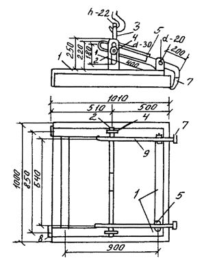 Примечание. По этому же ГОСТ промышленность изготавливает фигурные плиты и элементы мощения - 1 (Ф) и элементы декоративные дорожные - (ЭДД). 4.1.2. Конструктивные элементы тротуаров: - песчаный подстилающий слой; -основания из песка, цементно-песчаной смеси, бетона и щебня; - покрытие из плит. Технологическая последовательность работ по строительству сборных покрытий тротуаров включает следующие этапы: рытье и уплотнение корыта, установку бортового камня, устройство подстилающего слоя, устройство основания и покрытия, в том числе заполнение швов. 4.2. Технология устройства покрытий тротуаров.4.2.1. Плиты доставляют на объект автотранспортом в специальных контейнерах. Погрузо-разгрузочные работы и монтаж покрытия из плит размером сторон 100 см производят при помощи навесного оборудования конструкции СУ-32 треста строительства набережных и мостов Главмосинжстроя к 3 - 5-тонному автокрану или автопогрузчику (рис. 4.2.1.). Плиты размером сторон до 50 см можно укладывать в покрытия специальным вакуум-захватом круглой формы диаметром 400 мм, весом 7 кг, которым можно поднимать груз до 100 кг. Для обеспечения полного прилегания плит к основанию их окончательная посадка до проектной отметки производится специальным вибратором размером 40×40 см и мощностью двигателя 0,6 кВт, число колебаний - 280 в минуту (рис. 4.2.2.). Фигурные элементы мощения укладывают вручную или плитоукладчиком. 4.2.2. Укладку плит следует производить поперечными рядами от края до края тротуара. Перед укладкой плит должны быть разбиты и закреплены на основании две ограничивающие линии, от одной из которых начинается укладка плит. 4.2.3. Выравнивание граней плит производят по натянутой проволоке или шнуру, расположенному вдоль укладываемого ряда. 4.2.4. Ширина шва между смежными плитами с размером сторон 100 см должна быть в пределах 8 - 12 мм и с размером стороны до 50 см - в пределах 5 - 8 мм. Швы заполняют цементно-песчаной смесью в соотношении 1 : 3. 4.2.5. При устройстве декоративных покрытий ширину шва можно увеличить до 50 мм. В этом случае шов заполняется дерном или растительным грунтом и засеивается травой. Для обеспечения требуемой ширины швов между плитами применяют специальные шаблоны (рис. 4.2.3.). 4.2.6. При укладке плит с размером стороны 100 см выравнивание их производят при помощи такелажных багров после того, как нижняя плоскость плиты опущена краном на 2 - 3 см ниже верхней плоскости уложенных смежных плит. Какие-либо перекосы плиты недопустимы. При употреблении ломов обламывание кромок плит должно исключаться. 4.2.7. Выравнивание уложенных плит осуществляют легким постукиванием деревянными трамбовками. Уступы в швах смежных плит не должны превышать 2 мм. Образовавшийся у граней плит валик из песка или цементно-песчаной смеси срезают ручным шаблоном. Рис. 4.2.1. Захват для укладки плит: 1 - рама из труб прямоугольного сечения 40×60 мм; 2 - вал траверсы; 3 - скоба; 4 - полоса с вырезом; 5 - несущая траверса; 6 - палец; 7 - полоса размером 100×80×10 мм; 8 - полоса размером 150×100×10 мм; 9 - рычаг. Рис. 4.2.2. Захват для укладки плит со стороной 100 см. Рис. 4.2.3. Вакуум-захват для укладки плит размером 50×50 см. Рис. 4.2.4. Приспособления для контроля ширины швов: а) - штучный ограничитель; б) - шаблоны. 4.2.8. При устройстве покрытий в зимнее время целесообразно заранее, до наступления заморозков, подготовить земляное полотно, подстилающий сл