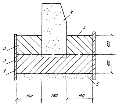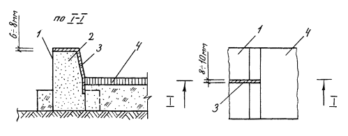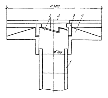 Рис. 5.2.3. Технологическая схема установки длинномерных бортовых камней. 5.2.7. Бетонные подкладки, укладываемые под стыки длинномерных камней заподлицо с песчаным основанием, изготовляют из бетона М300 размером 40×20×10 см. 5.2.8. Ширина швов между бортовыми камнями не должна превышать 5 мм. Заполнение швов производят цементным раствором состава 1 : 4, после чего расшивают раствором состава 1 : 2. Схема заделки шва между бортовыми камнями представлена на рис. 5.2.4. Рис. 5.2.4. Схема заделки шва между бортовыми камнями: 1 - бортовой камень; 2 - цементный раствор состава 1 : 4; 3 - цементный раствор состава 1 : 2; 4 - полотно дороги. 6. ОГОЛОВКИ СМОТРОВЫХ КОЛОДЦЕВ.6.1. Общие требования.6.1.1. Смотровые колодцы устраивают на проезжей части на реконструируемых и вновь строящихся участках различных подземных коммуникаций, а также при реконструкции дорожных покрытий. Колодцы состоят из рабочей камеры и горловины, служащей для спуска в камеру. 6.1.2. Регулируемые оголовки смотровых колодцев предназначены для установки на проезжей части дорог и обеспечивают надежное положение чугунного люка на верхней части горловины диаметром 700 мм в соответствии с отметкой проезжей части. Оголовок позволяет изменять высотное положение люка поворотом регулировочного кольца оголовка. 6.1.3. Регулируемый оголовок состоит из опорной плиты, имеющей гнездо, на клиновых площадках которого установлено поворотное регулировочное кольцо с обечайкой люка. 6.1.4. Регулируемые оголовки должны изготавливаться из бетона марки не ниже 300 по прочности на сжатие и марки не ниже 40 по прочности на растяжение при изгибе. 6.1.5. Последовательность установки оголовка: - подготовка и тщательное уплотнение зоны опирания оголовка; - монтаж опорной плиты по горловине колодца; - заливка мастикой «Изол» или горячим битумом кольцевого паза между горловиной и опорной плитой; - установка поворотного кольца; - заделка кольцевой полости между опорной плитой и поворотным кольцом. Схема установки оголовка представлена на рис. 6.1.1. 6.2. Технология установки регулируемых оголовков.6.2.1. Оголовки смотровых колодцев доставляют на строительные объекты автомобилями с шириной кузова не менее 215 см (МАЗ-205, ЗИЛ-130 и др.). Опорную плиту укладывают в кузов автомобиля срезами вдоль боковых бортов. 6.2.2. Разгрузку и монтаж оголовков производят стреловыми кранами грузоподъемностью 3 - 5 т. 6.2.3. Перед установкой регулируемого оголовка производят засыпку пазух вокруг колодца и горловины песчаным грунтом с тщательным уплотнением. Уплотнение производят вибробулавами, виброплощадками, малогабаритными катками и вибротрамбовочными плитами с поливом водой. Коэффициент уплотнения засыпки должен быть не менее 1,00. Рис. 6.1.1. Конструкция регулируемого оголовка смотрового колодца: 1 - регулировочное кольцо; 2 - крышка люка; 3 - поворотное кольцо; 4 - опорная плита; 5 - колодец. 6.2.4. Подготовку зоны опирания оголовка вокруг колодца производят с определением отметок по нивелиру. Отклонения ровности подготовленной поверхности основания от проектной не должны быть более 3 мм. 6.2.5. Опорную кольцевую плиту укладывают на основание, по которому распределяют без уплотнения слой песка или цементно-песчаной смеси толщиной 5 - 7 см. 6.2.6. Паз между опорной плитой и рабочей камерой колодца на 2/3 заделывают цементно-песчаной смесью. Верхнюю часть паза на 1/3 его высоты ге