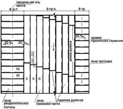 1 - плита проезжей части; 2 - дренаж; 3 - воронка; 4 - решетка; 5 - гидроизоляция; 6 - выравнивающий слой; 7 - трубка Рисунок 8.6 - Сопряжение гидроизоляции или защитно-сцепляющего слоя с водоотводной трубкой Вокруг водоотводной трубки укладывают секторные косынки гидроизоляционного материала или защитно-сцепляющего слоя и заводят их концы в раструб водоотводной трубки с нахлесткой кромок не менее 50 мм. 8.1.10 После выполнения гидроизоляции в водоотводной трубке следует выполнить основную гидроизоляцию, в которой делают крестообразный разрез и лепестки приклеивают внутри водоотводной трубки. Затем в водоотводную трубку устанавливают прижимной стакан или водо-приемную воронку и решетку. Пространство вокруг водоотводной трубки заполняют дренирующим материалом. 8.1.11 В соответствии с проектом следует выполнять устройство дренажной системы, состоящей из дренажных трубок и дренажных каналов, необходимых для отвода воды, попавшей на гидроизоляцию. 8.2 Устройство гидроизоляции и защитно-сцепляющего слоя из рулонных наплавляемых материалов8.2.1 Гидроизоляцию или защитно-сцепляющий слой из рулонных наплавляемых материалов на мостовых сооружениях рекомендуется выполнять из материалов, разработанных специально для применения в мостостроении, отвечающих техническим требованиям производителя. 8.2.2 Рулонные наплавляемые материалы укладывают в один слой по подготовленной в соответствии с 6.1 или 7.1 поверхности выравнивающего слоя на поверхности металлической ортотропной или железобетонной плиты. 8.2.3 Перед выполнением работ по наплавлению рулонного материала проверяют необходимость грунтования поверхности. На поверхности бетона или металла выделяют два участка площадью 1 м2. На одном из участков грунтуют поверхность, применяя для этих целей грунтовку, соответствующую классификационному типу используемого гидроизоляционного материала. На втором участке поверхность не грунтуют. На обоих участках производят наклейку гидроизоляционного материала, после чего производят проверку адгезии материала гидроизоляции к основанию в соответствии с 11.2.2.9. К производству работ следует принимать технологический процесс (с грунтованием или без), показавший лучшую адгезию. 8.2.4 В пределах ширины проезжей части рулоны наплавляемого материала раскатывают вдоль проезжей части, начиная от боковых ограждений и с нижних по уклону сечений моста. В пределах ширины тротуаров и разделительной полосы целесообразно производить раскатку рулонов поперек моста (см. рисунки 8.7 и 8.8). На тротуарах и в пределах разделительной полосы нахлестку полотнищ рулонных наплавляемых материалов в поперечном направлении производят с учетом продольного уклона - верхний рулон должен быть наклеен на нижний с верховой по уклону стороны.