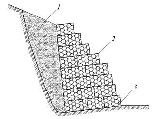 ступенчатой 1 - обратная засыпка; 2 - коробчатый габион; 3 - основание сооружения Рисунок 5 - Пример конструкции массивно-объемной стены со