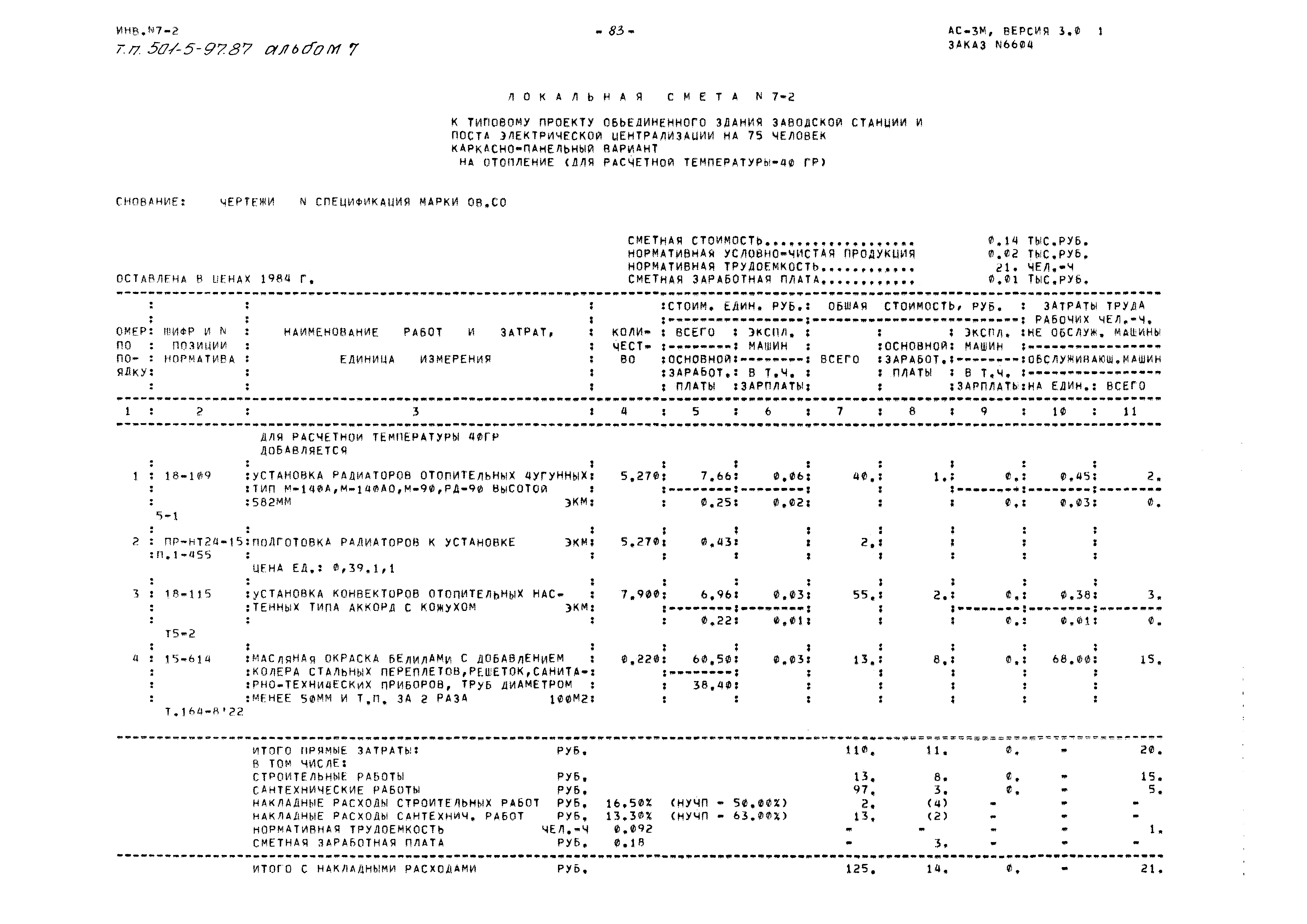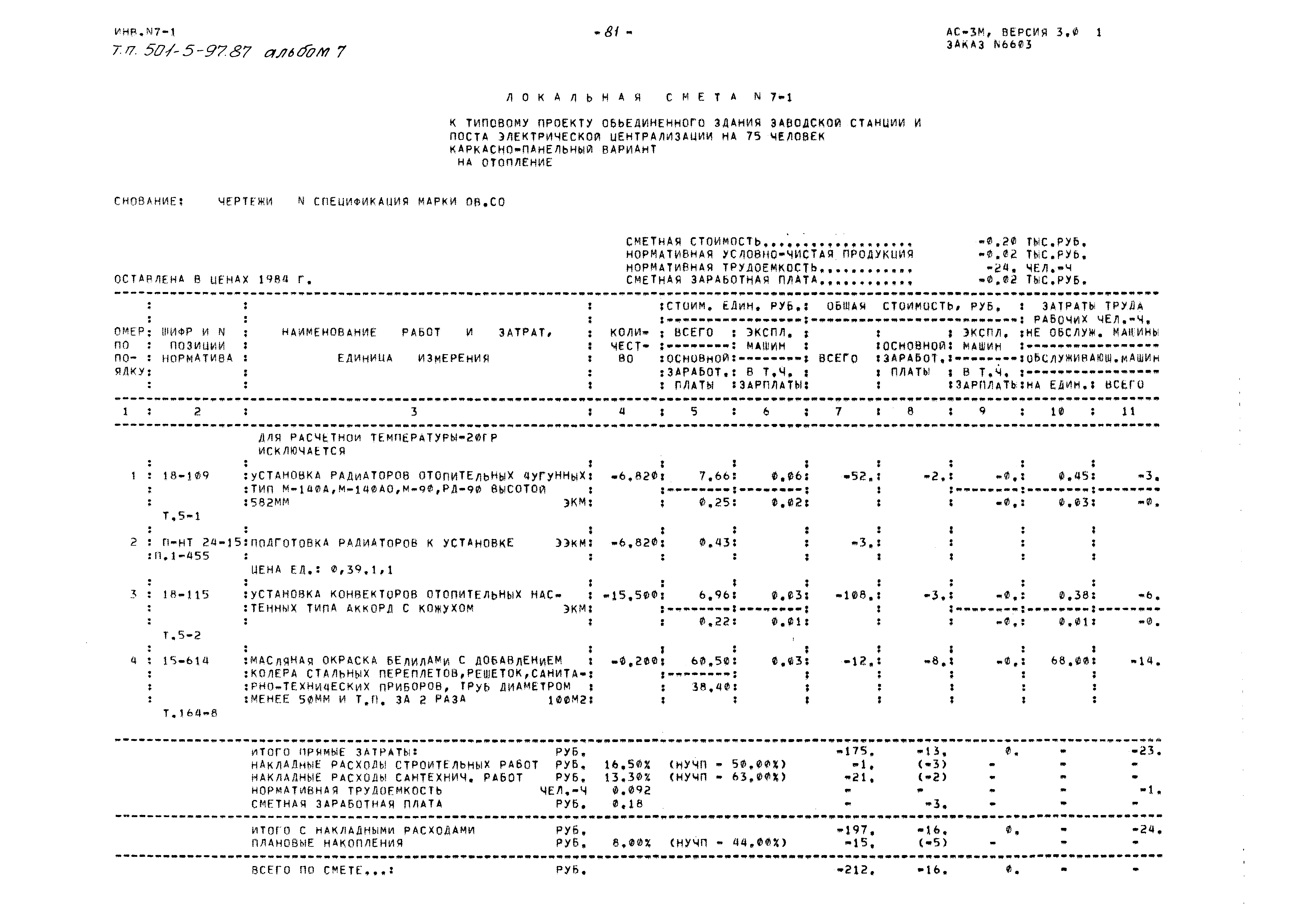 | Оглавление: | Объектная смета Локальная смета №1. Общестроительные работы Сводка объемов и стоимости работ к локальной смете №1 Локальная смета №1-1. Каркасно-панельный вариант (расчетная температура минус 20 градусов Цельсия) Локальная смета №1-2. Каркасно-панельный вариант (расчетная температура минус 20 градусов Цельсия) Локальная смета №1-3. Каркасно-панельный вариант, стены из ячеистого бетона (расчетная температура минус 20 градусов Цельсия) Локальная смета №1-4. Каркасно-панельный вариант, стены из ячеистого бетона (расчетная температура минус 30, 40 градусов Цельсия) Локальная смета №1-5. Каркасно-панельный вариант, свайные фундаменты (расчетная температура минус 20 градусов Цельсия) Локальная смета №1-6. Каркасно-панельный вариант, свайные фундаменты (расчетная температура минус 30, 40 градусов Цельсия) Локальная смета №2. Водопровод хозяйственно-питьевой, противопожарный Локальная смета №3. Горячее водоснабжение Локальная смета №4. Бытовая канализация Локальная смета №5. Дождевая канализация Локальная смета №6. Вентиляция Локальная смета №6-1. Вентиляция для расчетной температуры минус 40 градусов Цельсия Локальная смета №7. Отопление Локальная смета №7-1. Отопление для расчетной температуры минус 20 градусов Цельсия Локальная смета №7-2. Отопление для расчетной температуры минус 40 градусов Цельсия Локальная смета №8. Теплоснабжение Локальная смета №8-1. Теплоснабжение для расчетной температуры минус 40 градусов Цельсия Локальная смета №8-2. Теплоснабжение для расчетной температуры минус 40 градусов Цельсия Локальная смета №9. Узел управления Локальная смета №10. Электрическое освещение Локальная смета №10-1. Электрическое освещение (T = минус 30 градусов цельсия и выше) Локальная смета №11. Силовое электрооорудование Калькуляция к локальной смете №1 Локальная смета №12. Автоматизация Локальная смета №13. Молниезащита и заземление Локальная смета №14. Радиофикация Локальная смета №15. Телефонизация Локальная смета №16. Электрочасофикация Локальная смета №17. Пожарная сигнализация Локальная смета №18. Приобретение и монтаж технологического оборудования мастерской Локальная смета №19. Приобретение мебели и инвентаря Локальная смета №20. Приобретение технологического оборудования буфета Локальная смета №21. Приобретение оборудования гардероба Сводная ведомость потребности в производственных ресурсах |