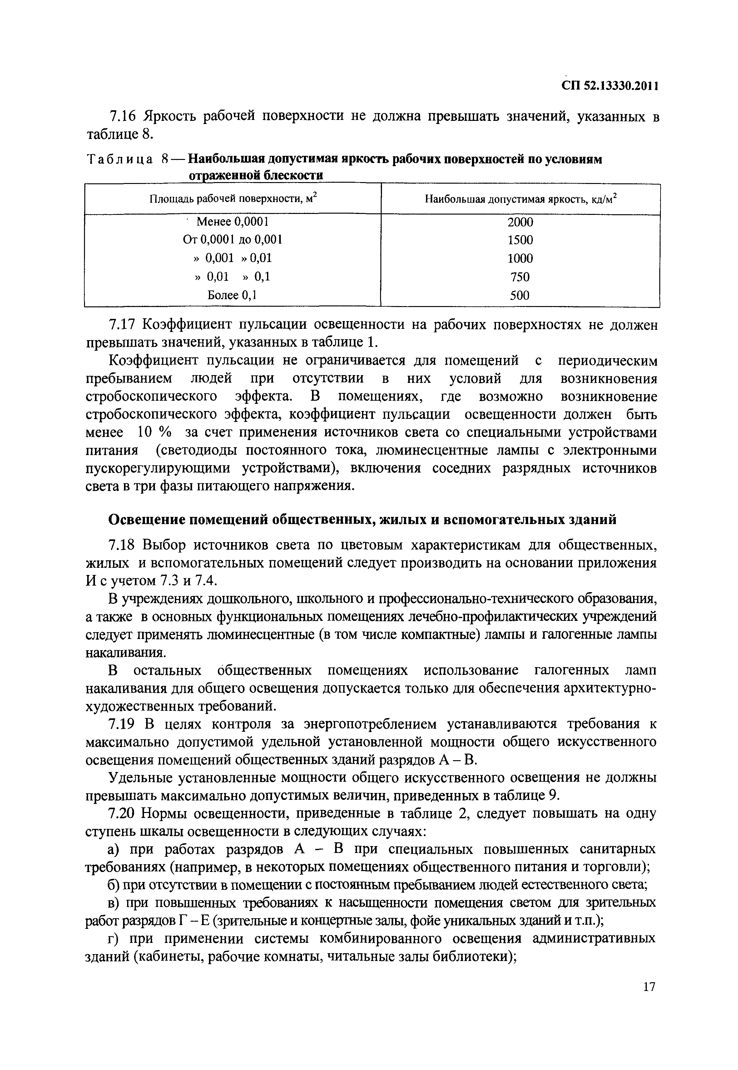 | Оглавление: | Введение 1 Область применения 2 Нормативные ссылки 3 Определения 4 Общие положения 5 Естественное освещение 6 Совмещенное освещение 7 Искусственное освещение Освещение помещений производственных и складских зданий Освещение помещений общественных, жилых и вспомогательных зданий Освещение площадок предприятий и мест производства работ вне зданий Освещение селитебных зон Освещение улиц, дорог и площадей Освещение пешеходных переходов Освещение автотранспортных тоннелей Освещение пешеходных пространств Освещение территорий жилых районов Наружное архитектурное освещение зданий и сооружений Витринное освещение Рекламное освещение Аварийное освещение Аварийное освещение автотранспортных тоннелей Охранное и дежурное освещение Приложение А. Справочное. Перечень нормативных документов Приложение Б. Обязательное. Термины и определения Приложение В. Обязательное. Определение разряда работ при расстоянии от различаемых объектов до глаз работающего более 0,5 м В1. Определение разряда работ при расстоянии от различаемых объектов до глаз работающего более 0,5 м В2. Определение эквивалентного размера протяженных объектов различения Приложение Д. Обязательное. Эксплуатационные группы светильников Приложение Е. Обязательное. Группы административных районов по ресурсам светового климата Приложение Ж. Обязательное. Яркостные зоны тоннеля в дневном режиме освещения Приложение З. Рекомендуемое. Рекомендуемые источники света для производственных помещений Приложение И. Рекомендуемое. Рекомендуемые источники света для общего освещения общественных и общедомовых помещений жилых зданий Приложение К. Обязательное. Нормативные показатели освещения основных помещений общественных, жилых и вспомогательных зданий Библиография |