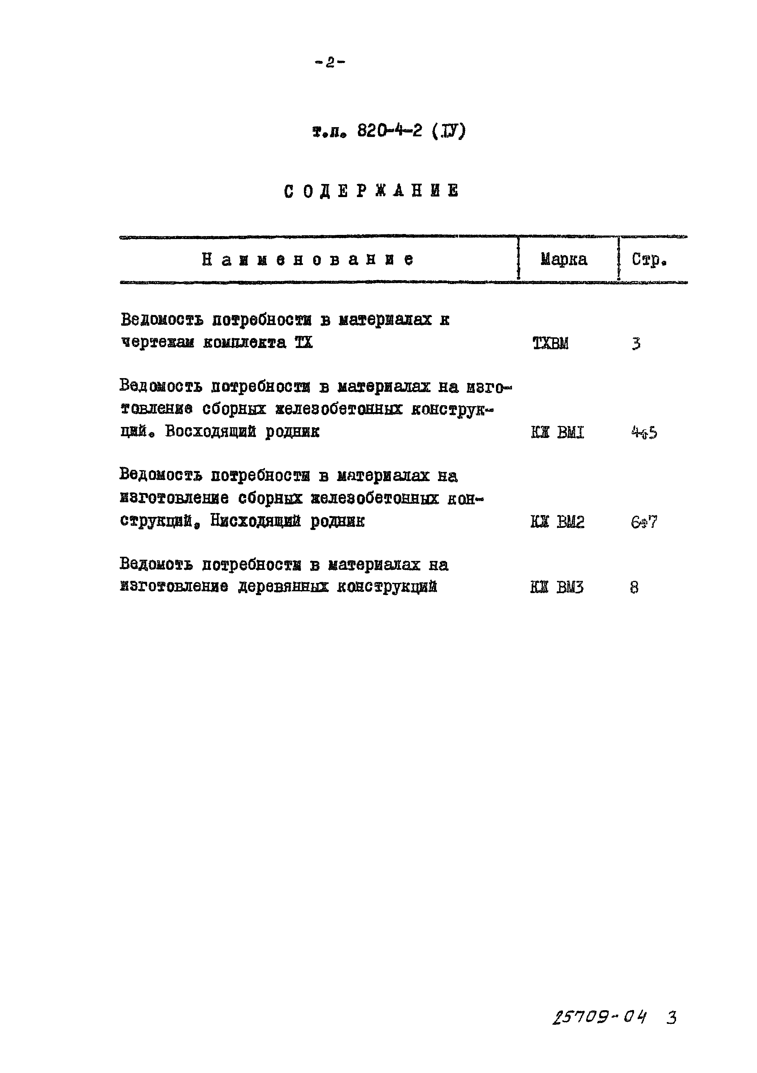| Оглавление: | ТП 820-4-2-ТХ.ВМ Ведомость потребности в материалах к чертежам комплекта ТХ ТП 820-4-2-КЖ.ВМ1 Ведомость потребности в материалах на изготовление сборных железобетонных конструкций. Восходящий родник ТП 820-4-2-КЖ.ВМ2 Ведомость потребности в материалах на изготовление сборных железобетонных конструкций. Нисходящий родник ТП 820-4-2-КЖ.ВМ3 Ведомость потребности в материалах на изготовление деревянных конструкций |